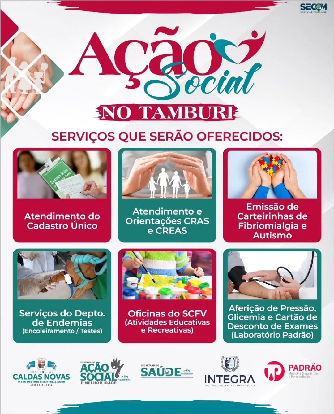 A Prefeitura de Caldas Novas, por meio da Secretaria Municipal de Ação Social e Melhor Idade, promove no próximo sábado (06/09) o evento “Ação Social no Tamburi”, com uma série de serviços gratuitos e atividades voltadas à comunidade.